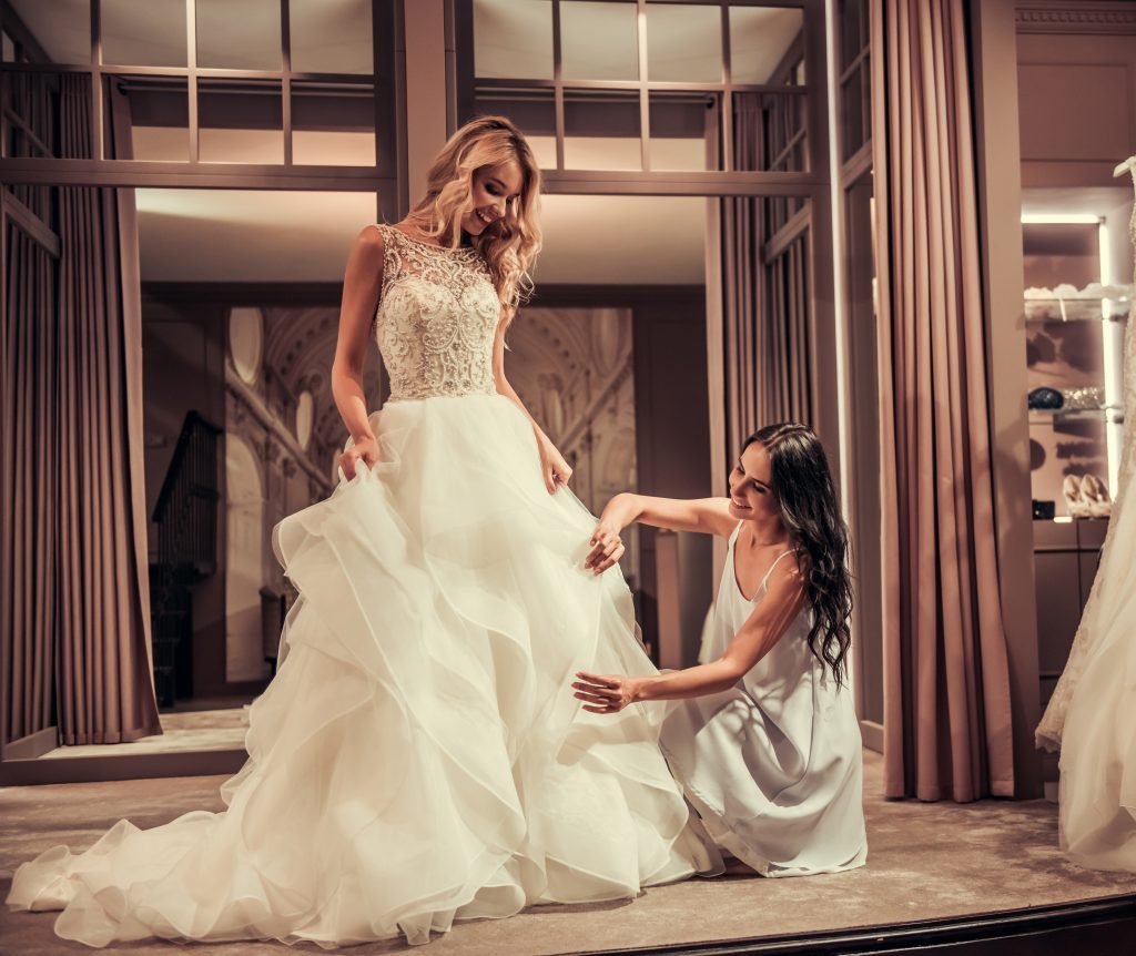 Beautiful bride is trying on an elegant wedding dress in modern wedding salon, young woman is helping